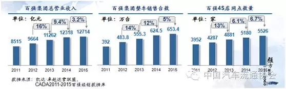 2015年百?gòu)?qiáng)企業(yè)營(yíng)業(yè)收入12,714億元,同比增長(zhǎng)3.2%,整體增速有所放緩;整車銷售數(shù)量同比增長(zhǎng)5%,數(shù)量達(dá)到653.4萬(wàn)臺(tái),增速亦有所放緩,其中二手車置換96萬(wàn)輛,對(duì)新車銷售的貢獻(xiàn)度持續(xù)增長(zhǎng);企業(yè)4S網(wǎng)點(diǎn)數(shù)量達(dá)到5,526家,同比增長(zhǎng)6.7%(自建+并購(gòu)),門店增長(zhǎng)速度保持穩(wěn)定。