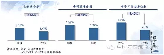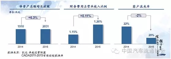 凈資產(chǎn):2015年百?gòu)?qiáng)經(jīng)銷商的凈資產(chǎn)總額達(dá)2031億元,增長(zhǎng)6.3%,較2014年的40%增幅大幅放緩;財(cái)務(wù)費(fèi)用:財(cái)務(wù)費(fèi)用的成本不斷上升,平均財(cái)務(wù)費(fèi)用占營(yíng)業(yè)收入比例增長(zhǎng)了0.11個(gè)百分點(diǎn);客戶流失:客戶流失的情況較2014年有所改善,2015年客戶流失率從22%降至20%。