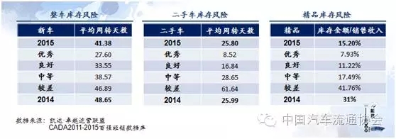 整車銷售:平均周轉(zhuǎn)天數(shù)由2014年的48.65天降低至41.38天,周轉(zhuǎn)率有所改善;二手車:平均周轉(zhuǎn)天數(shù)為25.8天,經(jīng)銷商管理水平稍有改善;精品:精品庫(kù)存風(fēng)險(xiǎn)和資金占用正在大幅降低,從2014年的31%降低至15.2%。