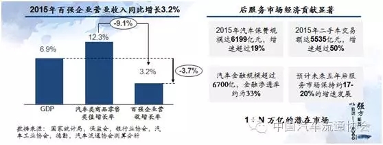 雖然百?gòu)?qiáng)企業(yè)營(yíng)收同比增長(zhǎng)3.2%,低于2015年GDP漲幅3.7個(gè)百分點(diǎn),同時(shí)低于汽車類商品零售額增長(zhǎng)率9.1個(gè)百分點(diǎn),但后服務(wù)市場(chǎng)的經(jīng)濟(jì)貢獻(xiàn)卻十分顯著,汽車保費(fèi)、二手車交易額、汽車金融規(guī)模將成為未來(lái)收入增長(zhǎng)的主要來(lái)源之一。