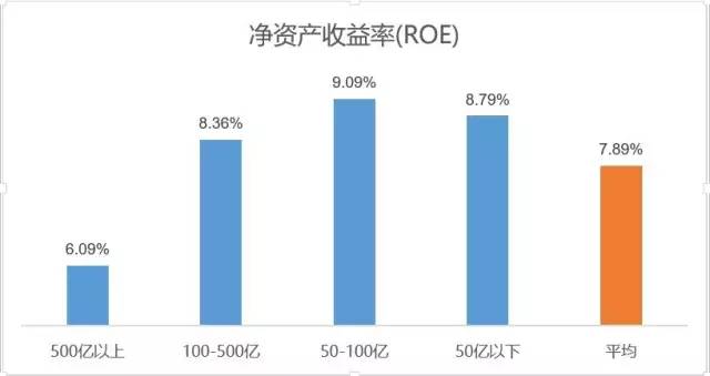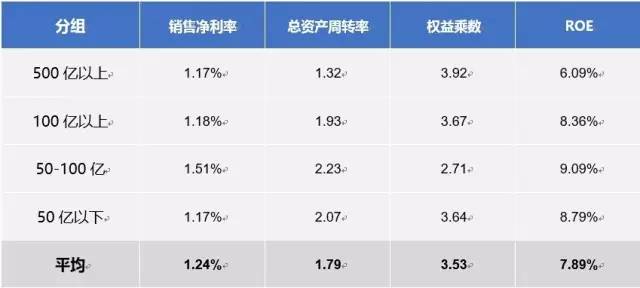 為了進一步剖析原因,我們再將凈資產收益率這個指標做拆解,得到銷售凈利率、總資產周轉率和權益乘數3個指標,來分析一下企業(yè)在銷售、運營和籌資方面都處于怎樣的水平。顯而易見,50-100億群組的集團在各方面發(fā)展最為均衡,權益乘數較低,發(fā)展最為穩(wěn)??;而500億以上集團資產周轉效率偏低,負債水平較高。