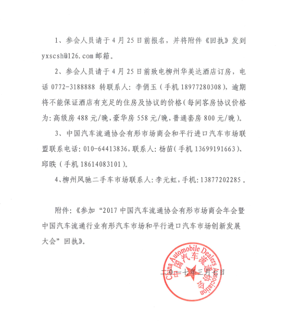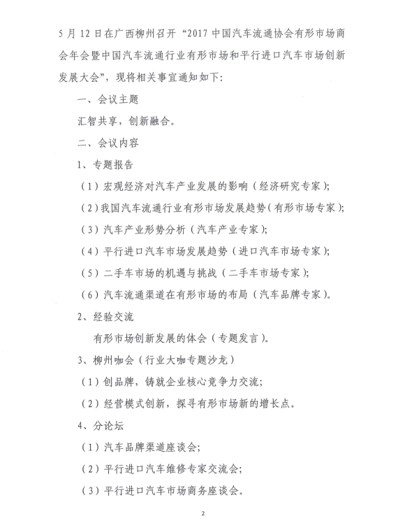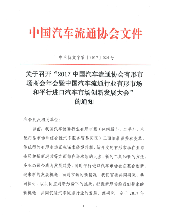 關于召開“2017中國汽車流通協(xié)會有形市場商會年會暨中國汽車流通行業(yè)有形市場和平行進口汽車市場創(chuàng)新發(fā)展大會”的通知