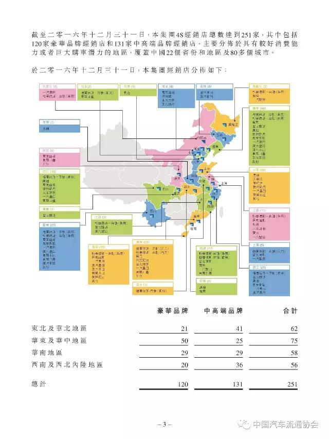 截止2016年12月31日,中升汽車4S店總數(shù)達到251家,其中包括120家豪華品牌經(jīng)銷店和131家中高端品牌經(jīng)銷店,覆蓋我國22個省份和地區(qū)及80多個城市。