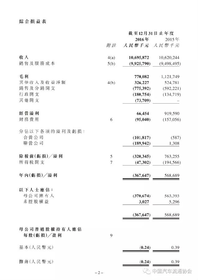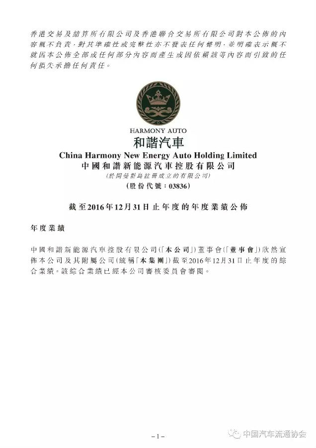 2015年百強(qiáng)汽車經(jīng)銷商集團(tuán)排行榜上榜企業(yè)中國和諧新能源汽車控股有限公司(以下簡稱“和諧汽車”)于今日公布了其公司及附屬公司2016年1月1日至2016年12月31日的綜合經(jīng)營業(yè)績。相關(guān)數(shù)據(jù)顯示,和諧汽車2016年總收入與上年基本持平,報告期內(nèi)未能實現(xiàn)盈利。