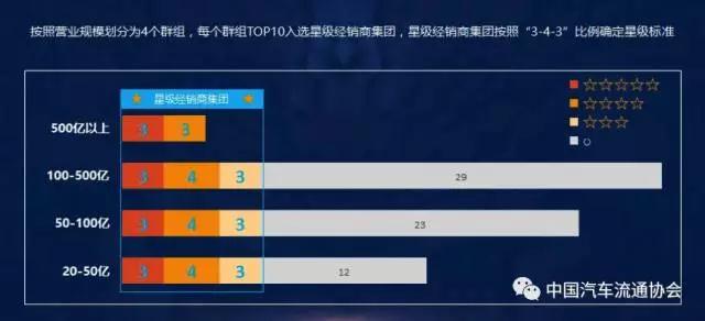 除了百強(qiáng)經(jīng)銷商集團(tuán)排名之外,中國汽車流通協(xié)會按照有效規(guī)模將百強(qiáng)經(jīng)銷商集團(tuán)劃分為4個級別,對每個級別排名前10的集團(tuán)按照綜合實(shí)力進(jìn)行星級評價,評選出百強(qiáng)綜合實(shí)力排名。