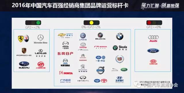 2016年中國(guó)汽車(chē)百?gòu)?qiáng)經(jīng)銷(xiāo)商集團(tuán)品牌運(yùn)營(yíng)標(biāo)桿卡顯示,經(jīng)營(yíng)奔馳、保時(shí)捷、雷克薩斯以及上汽通用五菱品牌車(chē)型的經(jīng)銷(xiāo)商集團(tuán)的GP2≧2%,經(jīng)營(yíng)寶馬、上汽大眾、別克、北京現(xiàn)代等品牌的經(jīng)銷(xiāo)商集團(tuán)的GP2介于0%與2%之間,經(jīng)營(yíng)奧迪、福特和東風(fēng)悅達(dá)起亞品牌的經(jīng)銷(xiāo)商集團(tuán)的GP2≦2%(GP2指包含應(yīng)收返利但不含新車(chē)衍生收入的裸車(chē)?yán)麧?rùn))。