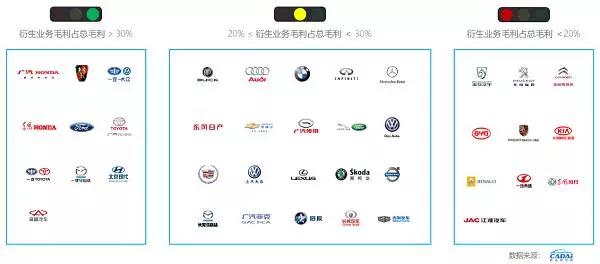 從品牌來看,各品牌間衍生業(yè)務的盈利能力不盡相同。凱達研究院根據(jù)衍生業(yè)務的毛利占比將主流品牌標記為“紅綠燈”的形式,直觀體現(xiàn)衍生業(yè)務的盈利能力和盈利空間: