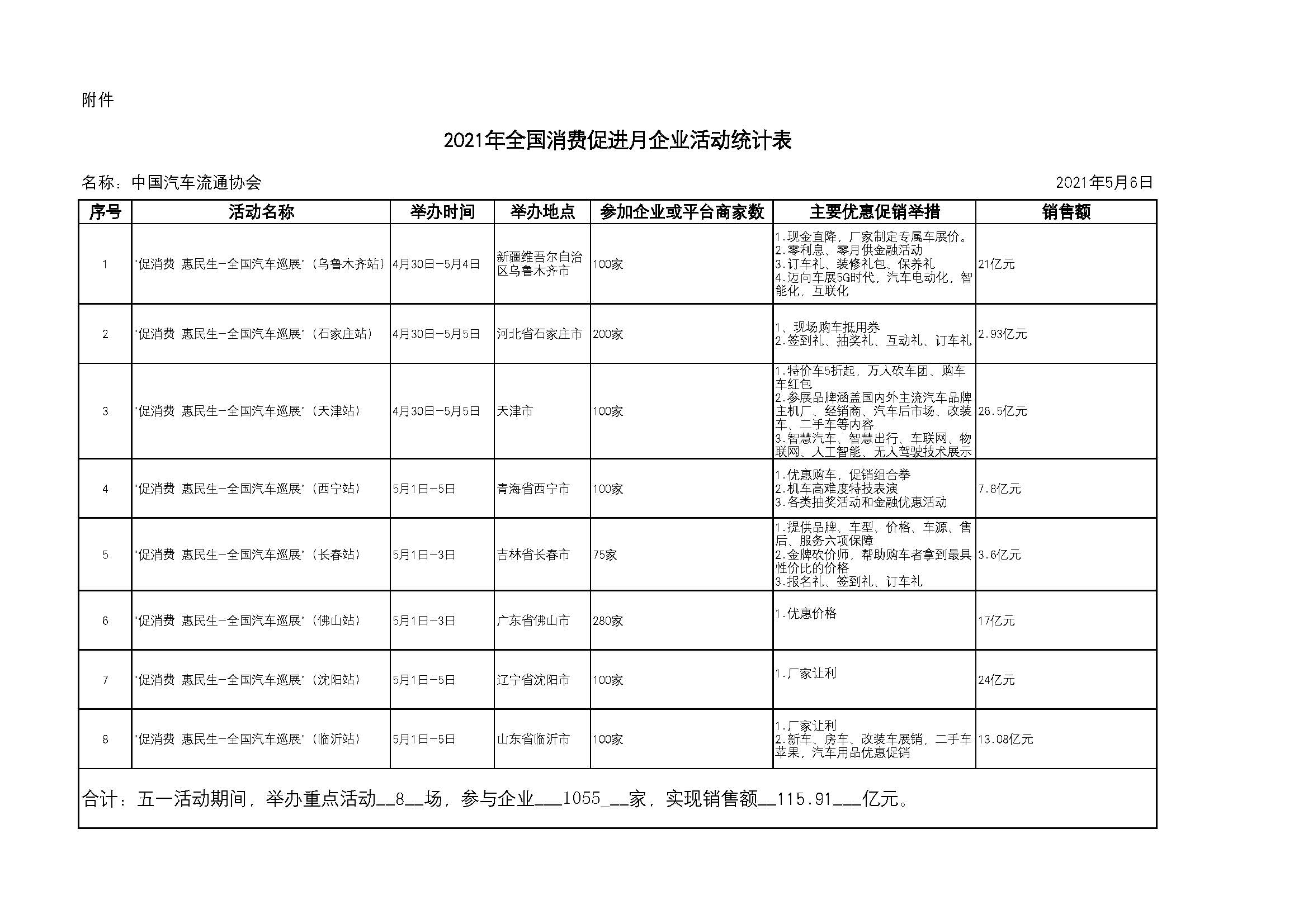 在商務(wù)部指導(dǎo)下,配合消費(fèi)促進(jìn)月活動(dòng)的開(kāi)展,中國(guó)汽車(chē)流通協(xié)會(huì)聯(lián)合各地政府和相關(guān)會(huì)員單位,共同舉辦“促消費(fèi) 惠民生-全國(guó)汽車(chē)巡展”系列活動(dòng),五一期間已成功舉辦八期:烏魯木齊站,石家莊站,天津站,西寧站,長(zhǎng)春站,佛山站,沈陽(yáng)站,臨沂站,八場(chǎng)共實(shí)現(xiàn)銷(xiāo)售額115.91億元。銷(xiāo)售量80369輛,參與企業(yè)1055家,具體情況后附。