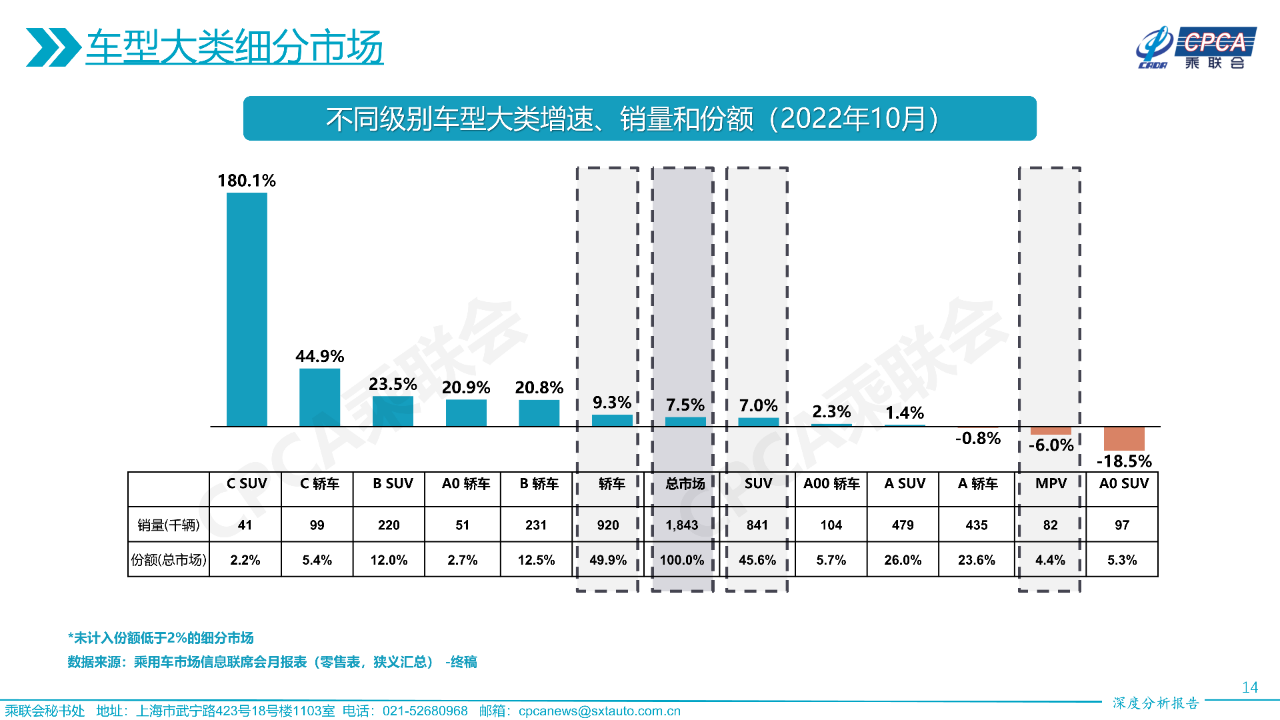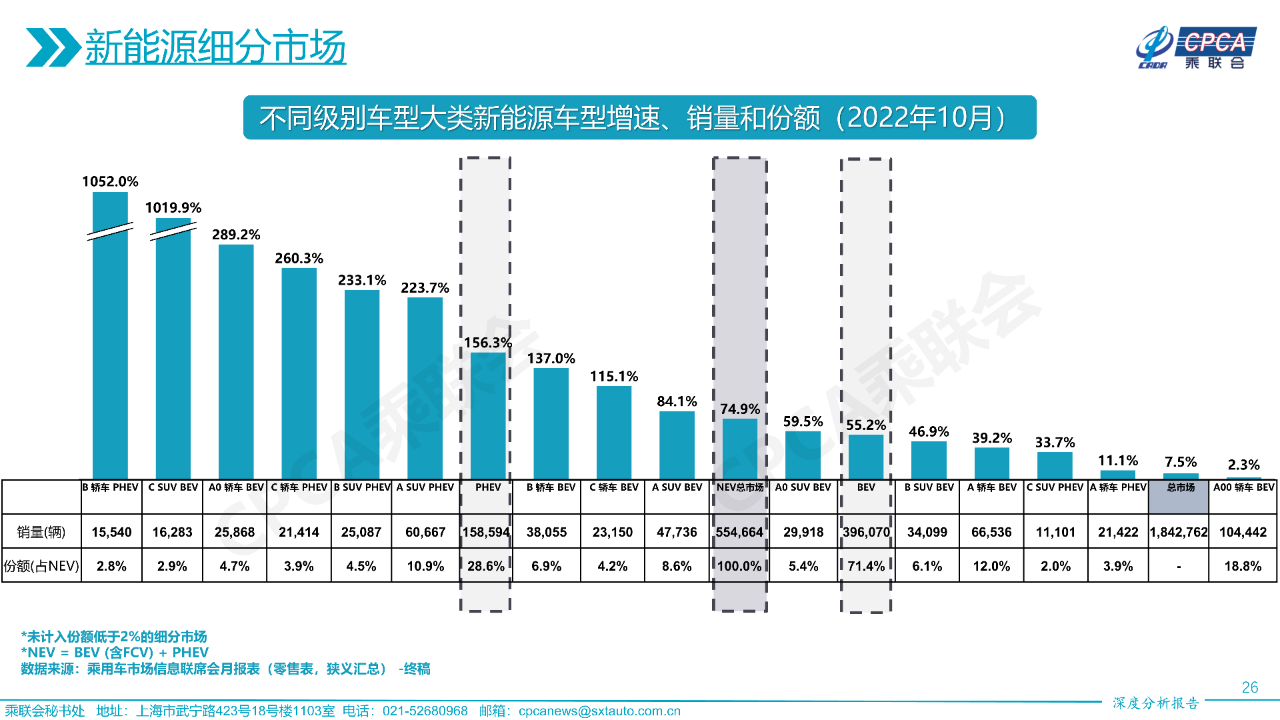 不同級別車型大類新能源車型增速、銷量和份額——2022年10月及累計