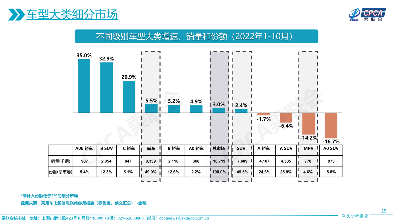 不同級別車型大類增速、銷量和份額——2022年10月及累計