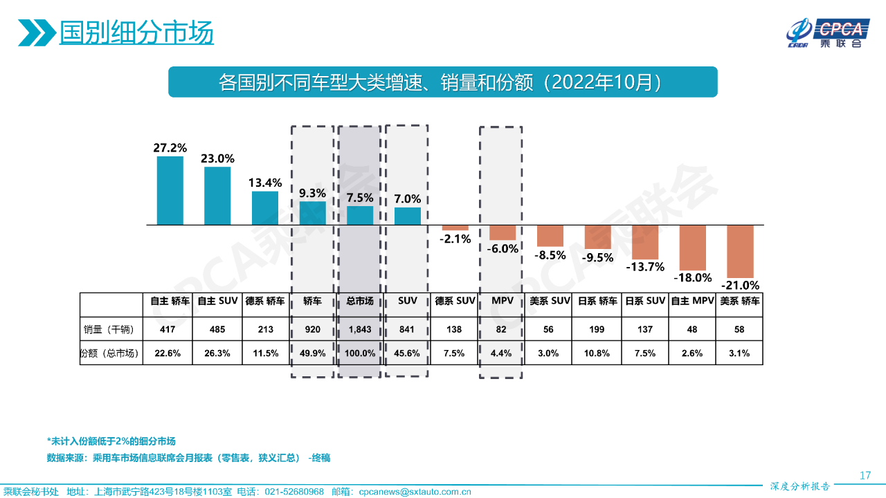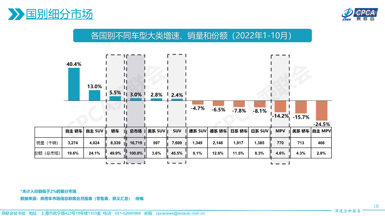 各國別不同車型大類增速、銷量和份額——2022年10月及累計