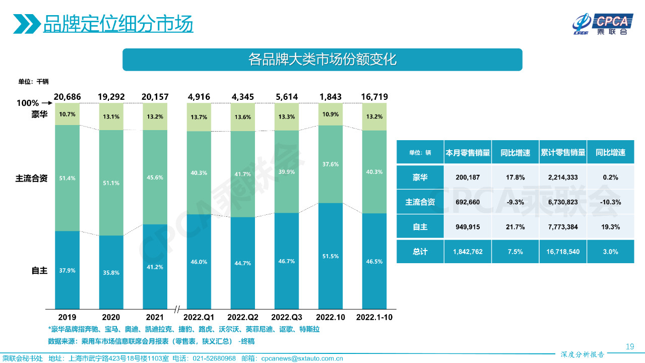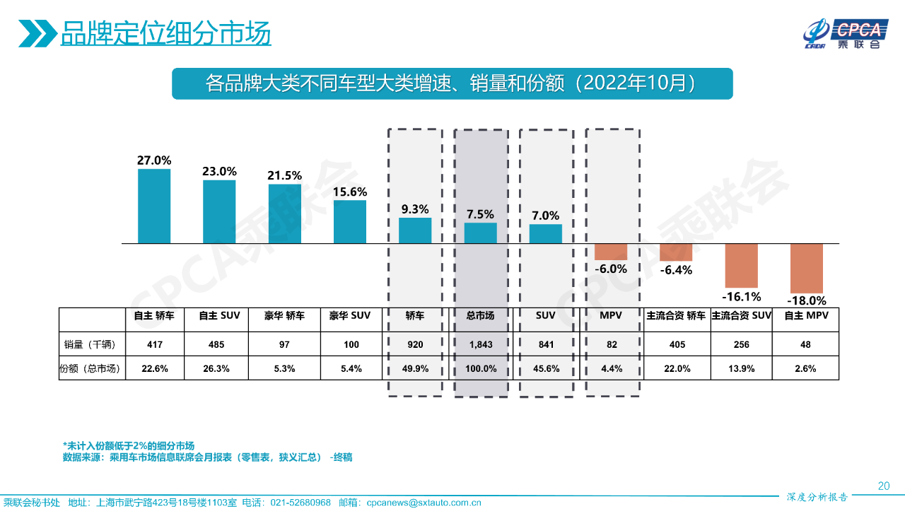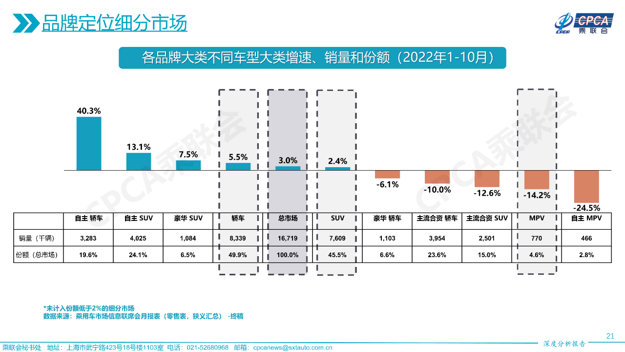 各品牌大類下不同車型大類增速、銷量和份額——2022年10月及累計