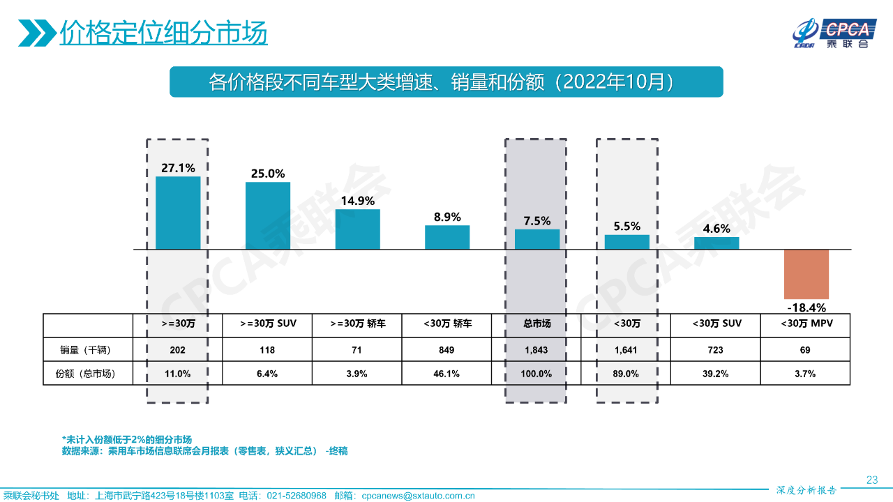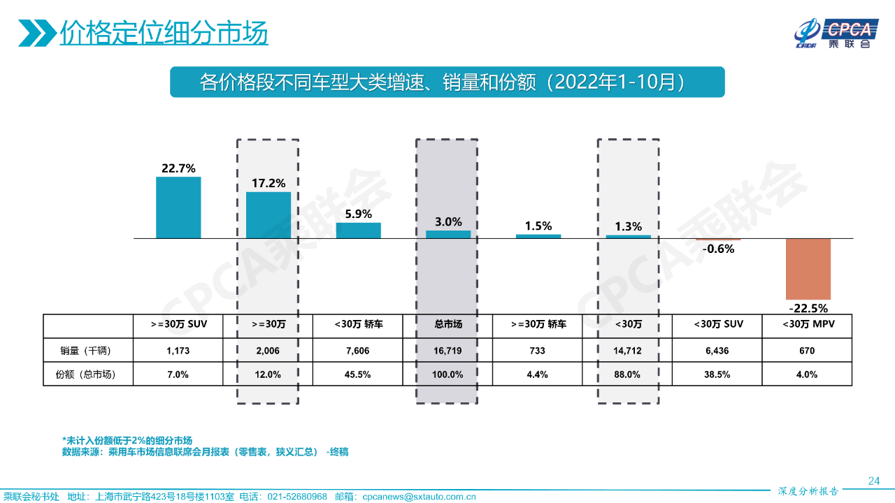 各價格段不同車型大類增速、銷量和份額——2022年10月及累計