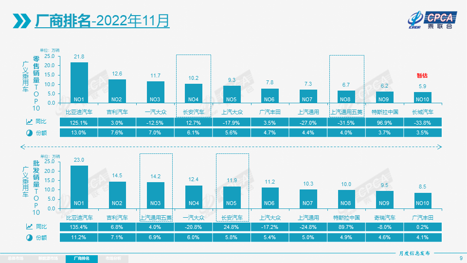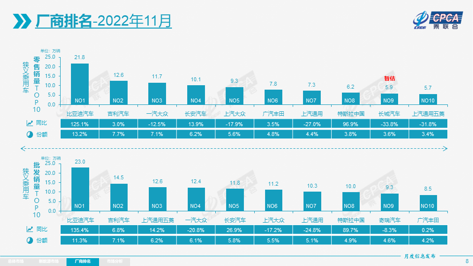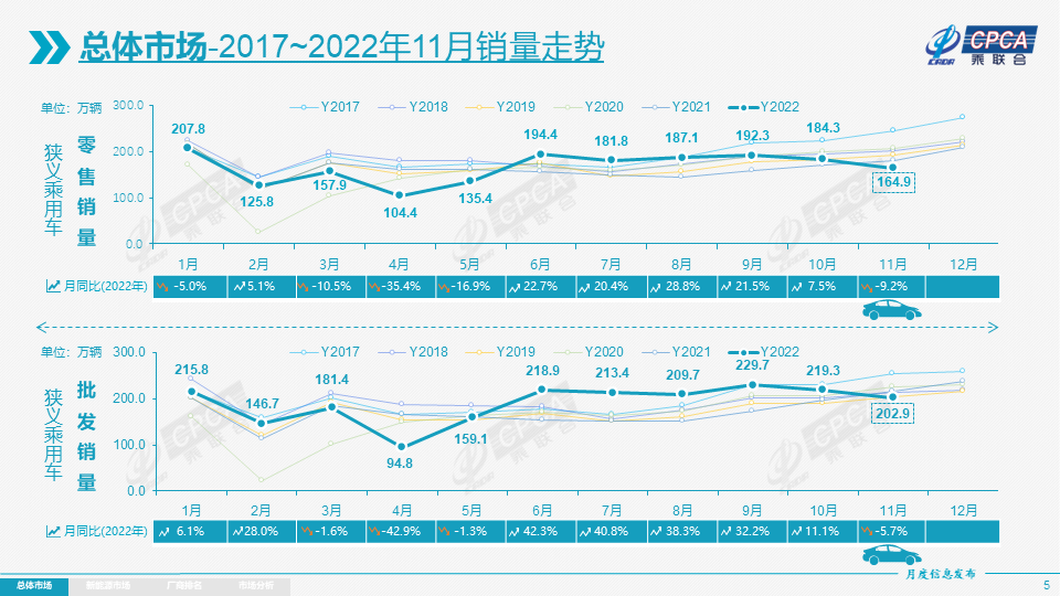零售:2022年11月乘用車市場零售達(dá)到164.9萬輛,同比下降9.2%;11月零售環(huán)比下降10.5%,這是自2008年以來首次出現(xiàn)“金九銀十銅十一”的環(huán)比下降特征。1-11月累計(jì)零售1836.7萬輛,同比增長1.8%,同比凈增31.7萬輛,其中購車稅優(yōu)惠政策啟動(dòng)以來的6-11月同比增加139萬輛,增量貢獻(xiàn)巨大。今年11月新冠疫情在全國各地散發(fā)的局面較明顯。11月全國有29個(gè)省報(bào)告確診病例61,356例,較10月28個(gè)省8,241例的總量稍有增多;但全國29個(gè)省11月報(bào)告有547,488例無癥狀,較10月29個(gè)省的31,647例有較大回升。11月疫區(qū)擴(kuò)大到廣東、重慶、河南、內(nèi)蒙、北京等好幾個(gè)汽車消費(fèi)大省,因此封控對車市店端供給與消費(fèi)購買的兩端均有所沖擊,這個(gè)秋冬季出現(xiàn)了異常的零售持續(xù)下行走勢。當(dāng)前零售渠道庫存總量充裕,去年芯片斷供的基數(shù)影響逐步消除,這些都有效穩(wěn)定了車市的增長。但近期常規(guī)燃油車市場壓力仍較大。11月全國常規(guī)燃油乘用車(不含新能源車)零售105萬輛,環(huán)比下降18%,同比去年11月下降27%,逆轉(zhuǎn)了今年6-9月同比增長6%的正增長態(tài)勢。1-11月的常規(guī)燃油車市場零售1,334萬輛,同比下降14%。入門級(A級)燃油車是民生類車型需求,同比下降29%;新能源車是增換購的改善型需求,同比零售增長79%。目前看,中低收入首購群體的消費(fèi)信心急需提振,消費(fèi)需求支撐力不足,有待釋放,政策仍需向燃油車中的節(jié)能車施以更大力度傾斜,在經(jīng)濟(jì)效應(yīng)和環(huán)保要求兩者之間尋求平衡。11月車市促銷力度進(jìn)一步加大,主流車企均追加了優(yōu)惠活動(dòng)力度,努力彌補(bǔ)前期因疫情造成的銷量損失,爭取年末達(dá)到預(yù)期目標(biāo)的最好效果。11月豪華車零售24萬輛,同比增長13%,環(huán)比增15%。車購稅減半政策對消費(fèi)升級的高端消費(fèi)促進(jìn)較大。11月自主品牌零售87萬輛,同比增長5%,環(huán)比下降7%。11月自主品牌國內(nèi)零售份額為53.4%,同比增長7.1個(gè)百分點(diǎn);1-11月累計(jì)份額47%,相對于2021年同期增長6.3個(gè)百分點(diǎn)。11月自主品牌批發(fā)市場份額55.2%,較去年同期份額增加8.4個(gè)百分點(diǎn);1-11月自主品牌累計(jì)份額50%,相對于2021年同期增加5.6個(gè)百分點(diǎn)。自主品牌在新能源市場和出口市場獲得明顯增量,頭部傳統(tǒng)車企轉(zhuǎn)型升級表現(xiàn)優(yōu)異,比亞迪汽車、吉利汽車、長安汽車、奇瑞汽車等傳統(tǒng)車企品牌份額提升明顯。11月主流合資品牌零售54萬輛,同比下降31%,環(huán)比下降23%。11月的德系品牌零售份額18.9%,同比增長0.1個(gè)百分點(diǎn),日系品牌零售份額15.3%,同比下降6.9個(gè)百分點(diǎn)。美系品牌市場零售份額達(dá)到9.6%,同比增加0.6個(gè)百分點(diǎn)。出口:11月海關(guān)統(tǒng)計(jì)汽車出口37萬輛,同比增長71%;1-11月累計(jì)出口298萬輛,同比增長54%。乘聯(lián)會統(tǒng)計(jì)口徑下的11月乘用車出口(含整車與CKD)25萬輛,同比增長54%,環(huán)比下降4%。11月新能源車占出口總量的33%。11月自主品牌出口達(dá)到19.0萬輛,同比增長52%,環(huán)比增1%;合資與豪華品牌出口6.2萬輛,同比增長60%。1-11月乘用車?yán)塾?jì)出口210萬輛,增56%。自主品牌對歐美市場和第三世界國家市場出口全面突破,國際品牌的中國基地出口戰(zhàn)略也日益體現(xiàn)。 生產(chǎn):11月乘用車生產(chǎn)207.8萬輛,同比下降6.7%,環(huán)比下降9.0%,疫情封控對產(chǎn)業(yè)鏈帶來一定影響,其中豪華品牌生產(chǎn)同比增長9%,環(huán)比增長3%;合資品牌生產(chǎn)同比下降27%,環(huán)比下降16%;自主品牌生產(chǎn)同比增長7%,環(huán)比下降7%。1-11月的車企生產(chǎn)達(dá)到2123.1萬輛,同比增長14.9%。11月部分主力企業(yè)強(qiáng)力調(diào)整生產(chǎn),日系車企與部分自主品牌努力調(diào)產(chǎn)穩(wěn)庫存,有利于經(jīng)銷商體系的庫存均衡。批發(fā):11月廠商批發(fā)銷量202.9萬輛,同比下降5.7%,環(huán)比下降7.5%,受新能源市場拉動(dòng)的影響,部分車企表現(xiàn)分化明顯。11月自主車企批發(fā)111.2萬輛,同比增長12%,環(huán)比下降5%。主流合資車企批發(fā)62萬輛,同比下降31%,環(huán)比下降18%。豪華車批發(fā)29萬輛,同比增長15%,環(huán)比增長8%。1-11月的乘用車廠商批發(fā)銷量達(dá)到2092.5萬輛,同比增長11.7%。廠商銷量領(lǐng)軍的比亞迪汽車、吉利汽車、上汽通用五菱、長安汽車同比去年11月增量貢獻(xiàn)也是較好的,廣汽埃安的增量也很強(qiáng)。庫存:11月的產(chǎn)銷不如10月順暢,形成廠商批發(fā)低于產(chǎn)量5萬輛、廠商國內(nèi)批發(fā)高于零售13萬輛的艱難產(chǎn)銷走勢,預(yù)期中的年末零售強(qiáng)增長尚未出現(xiàn), 11月廠商迅速調(diào)整產(chǎn)銷節(jié)奏。2021年四季度以來廠商庫存迅速回補(bǔ),2022年1-11月累計(jì)補(bǔ)庫近31萬,其中5-11月庫存回補(bǔ)較大。由于購置稅減半政策在6月實(shí)施,5月以來經(jīng)銷商備庫增量貢獻(xiàn)較大。11月份經(jīng)銷商庫存環(huán)比增長13萬輛,1-11月累計(jì)增長45萬輛,而2021年1-11月廠商庫存下降了66萬輛,今年的廠商庫存被動(dòng)建儲的壓力較大。世界疫情下的缺貨嚴(yán)重,前期中國車市庫存恢復(fù)到中高位水平是難得成就,為出口