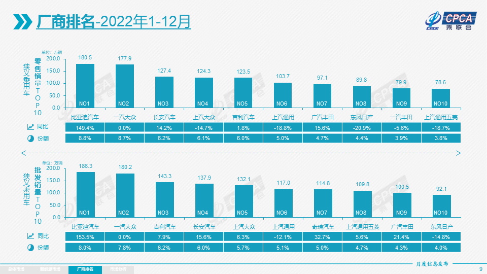 零售:2022年12月乘用車市場零售達到216.9萬輛,同比去年增長3.0%,與11月同比下降9.1%形成巨大的反差,12月零售較上月增長31.4%,這也是2008年以來最強的12月環(huán)比增速。1-12月累計零售2,054.3萬輛,同比增長1.9%,同比凈增38.6萬輛,其中購車稅優(yōu)惠政策啟動以來的6-12月同比增加145.2萬輛,雖因11月負增長而稍低于我們預估的車購稅政策帶來200萬輛增量,但政策增量貢獻仍是巨大。“新十條”改變了車市的封控狀態(tài),市場明顯回升,部分有購買力的消費者希望盡快提車,以免感染或重復感染。部分政策到期加上今年春節(jié)假期較早,引導消費需求前置,行業(yè)終端價格持續(xù)下滑,刺激需求,也激發(fā)了消費者的購買欲望,12月中下旬燃油車車市暴增也是符合預期的強增長。當前零售渠道庫存總量充裕,有效促進了12月車市的增長。但近期常規(guī)燃油車市場壓力仍較大。12月全國常規(guī)燃油乘用車(不含新能源車)零售153萬輛,同比去年12月降6%,環(huán)比增長45%,低于今年6-9月同比增長6%的正增長態(tài)勢。在2019年1,968萬輛、2020年1,818萬輛、2021年1,716萬輛的基礎上,2022年的常規(guī)燃油車市場零售1,487萬輛,同比下降13%。A級燃油車是民生類需求車型,受疫情等因素沖擊而需求同比下降14%;新能源車是增換購消費者的改善型需求,零售同比增長89%。目前看,受疫情沖擊最重的中低收入首購群體的消費信心急需提振,消費需求支撐力不足,有待釋放,政策仍需向燃油車中的節(jié)能車施以更大的傾斜力度,在經(jīng)濟效應和環(huán)保要求兩者之間尋求到最佳平衡。12月上旬的車市促銷力度進一步加大,主流車企均追加了優(yōu)惠活動力度,努力彌補前期因疫情造成的銷量損失,爭取年末達到預期目標的最好效果。12月豪華車零售26萬輛,同比增長6%,環(huán)比增10%。車購稅減半政策對消費升級的高端消費促進較大。12月自主品牌零售106萬輛,同比增長13%,環(huán)比增長20%。12月自主品牌國內零售份額為48.9%,同比增長3.8個百分點;1-12月累計份額47%,相對于2021年同期增長6.1個百分點。12月自主品牌批發(fā)市場份額57.5%,較去年同期份額增加10個百分點;1-12月自主品牌累計份額50%,相對于2021年同期增加6個百分點。自主品牌在新能源市場和出口市場獲得明顯增量,頭部傳統(tǒng)車企轉型升級表現(xiàn)優(yōu)異,比亞迪汽車、吉利汽車、長安汽車、奇瑞汽車等傳統(tǒng)車企品牌份額提升明顯。