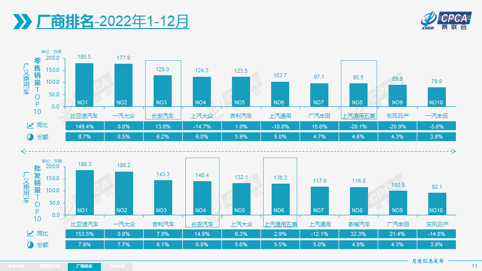 12月主流合資品牌零售85萬輛,同比下降8%,環(huán)比增長59%。12月的德系品牌零售份額20.6%,同比增長2.3個百分點,日系品牌零售份額18.7%,同比下降4.4個百分點。美系品牌市場零售份額達到8.5%,同比下降1.4個百分點。出口:乘聯(lián)會統(tǒng)計口徑下的12月乘用車出口(含整車與CKD)26萬輛,同比增長50%,環(huán)比增長3%。12月新能源車占出口總量的28%。隨著出口運力的提升,12月自主品牌出口達到22.7萬輛,同比增長52%,環(huán)比增19%;合資與豪華品牌出口3.3萬輛,同比增長41%。2022年全年乘用車累計出口236.3萬輛,增55%。自主品牌對歐美市場和第三世界國家市場出口全面突破,國際品牌的中國基地出口戰(zhàn)略仍在維持。生產(chǎn):12月乘用車生產(chǎn)209.5萬輛,同比下降15.0%,環(huán)比下降0.8%,疫情封控對產(chǎn)業(yè)鏈影響基本消除,車企主動減產(chǎn)降庫存力度強。其中豪華品牌生產(chǎn)同比下降19%,環(huán)比下降13%;合資品牌生產(chǎn)同比下降40%,環(huán)比下降9%;自主品牌生產(chǎn)同比增長9%,環(huán)比增長7%。1-12月的車企生產(chǎn)達到2,336.7萬輛,同比增長11.6%。12月部分主力企業(yè)強力調整生產(chǎn),外資車企與部分合資車企努力調產(chǎn)穩(wěn)庫存,有利于經(jīng)銷商體系的庫存均衡。自主品牌產(chǎn)銷需要謹慎。批發(fā):12月廠商批發(fā)銷量222.2萬輛,同比下降6.1%,環(huán)比增長9.4%,受新能源市場拉動的影響,部分車企表現(xiàn)分化明顯。12月自主車企批發(fā)127.2萬輛,同比增長15%,環(huán)比增長14%。主流合資車企批發(fā)68.2萬輛,同比下降29%,環(huán)比增長10%。豪華車批發(fā)26.7萬輛,同比降10%,環(huán)比降9%。1-12月的乘用車廠商批發(fā)銷量達到2,315.4萬輛,同比增長9.8%,增量206.0萬輛。比亞迪汽車、長安汽車、上汽通用五菱、廣汽傳祺、廣汽埃安、東風風神等廠商銷量同比去年12月增量貢獻也是較好的。庫存:12月廠商努力控制生產(chǎn)和批發(fā)節(jié)奏實現(xiàn)強力降庫存,形成廠商產(chǎn)量低于批發(fā)13萬輛、廠商國內批發(fā)低于零售21萬輛的去庫存走勢,預期中的年末燃油車零售強增長在疫情防控“新十條”發(fā)布后如期出現(xiàn), 12月廠商庫存迅速大幅降低的幅度超預期。2021年四季度以來廠商庫存迅速回補,2022年1-12月累計補庫近21萬,其中5-11月庫存回補較大。由于購置稅減半政策在6月實施,5月以來經(jīng)銷商備庫增量貢獻較大。12月份經(jīng)銷商庫存環(huán)比下降21萬輛,1-12月累計增長25萬輛,而2021年1-12月廠商庫存下降了15萬輛,今年的廠商庫存偏高的壓力部分化解。世界疫情下的缺貨嚴重,前期中國車市庫存恢復到中高位水平是難得成績,為出口和內銷奠定穩(wěn)定局面。由于庫存有保障,全國乘用車出口也在8-12月保持25萬輛左右的歷史高位。新能源:12月新能源乘用車批發(fā)銷量達到75.0萬輛,同比增長48.9%,環(huán)比增2.5%,在車購稅減半政策下,新能源車不僅沒有受到影響,反而持續(xù)走強。1-12月新能源乘用車批發(fā)649.8萬輛,同比增長96.3%。12月新能源乘用車零售銷量達到64.0萬輛,同比增長35.1%,環(huán)比增6.5%,1-12月保持趨勢性上升走勢。1-12月新能源乘用車國內零售567.4萬輛,同比增長90.0%。新能源車市場方面,供給改善疊加油價高位帶來市場火爆,油價歷史高位而電價鎖定,帶動電動車訂單表現(xiàn)持續(xù)較強。12月初的新能源車與傳統(tǒng)燃油車環(huán)比走勢都受到個別地區(qū)防疫措施的影響,閉店情況較突出。隨著“新十條”的有效落實,車市的傳統(tǒng)車迅速火爆,新能源車也小幅升溫,但低于預期。1) 批發(fā):12月新能源車廠商批發(fā)滲透率33.7%,較2021年12月21.3%的滲透率提升12個百分點。12月,自主品牌新能源車滲透率50.6%;豪華車中的新能源車滲透率26.8%;而主流合資品牌新能源車滲透率僅有5.0%。12月純電動批發(fā)銷量56.3萬輛,同比增長33.6%;插電混動銷量18.7萬輛,同比增長127.1%,新能源車占比25%,較同期增加9個點占比。12月B級電動車銷量13.8萬輛同比增長17%,環(huán)比降21%,占純電動份額24%。純電動市場的A00+A0級經(jīng)濟型電動車市場崛起,其中A00級批發(fā)銷量14.9萬輛,同比增長4%,環(huán)比增長7%,占純電動的27%份額;A0級批發(fā)銷量10.9萬輛,占純電動的19%份額;A級電動車15.4萬,占純電動份額27%;各級別電動車銷量相對均衡化。12月新能源乘用車批發(fā)前三排名為:五菱宏光MINI達73,009輛、比亞迪宋達到70,079輛、Model Y銷量35,750輛;而燃油車前二分別是:速騰35,329輛、朗逸33,887輛。由此可見新能源領軍車型五菱宏光較燃油車領軍車型速騰的銷量高出1倍。2) 零售:12月新能源車國內零售滲透率29.5%,較2021年12月22.6%的滲透率提升7個百分點。12月,自主品牌中的新能源車滲透率51.0%;豪華車中的新能源車滲透率22.8%;而主流合資品牌中的新能源車滲透率僅有4.9%。從月度國內零售份額看,12月主流自主品牌新能源車零售份額70.6%,同比增加11.4個百分點;合資品牌新能源車份額6.5%,同比增加0.8個百分點;新勢力份額13.5%,同比下降4.5個百分點;特斯拉份額6.6%,下降8.3個百分點。12月起售價10萬元以下新能源車占比21.8%,較去年12月下降9個百分點;10-20萬占比44%,提升8個百分點;20-30萬占比23.3%,同比降2個百分點;30-40萬占比7.4%,增1個百分點;40萬以上占比3.49%,增2個百分點。3) 出口:12月新能源乘用車出口7.4萬輛,伴隨著疫情下復工復產(chǎn)政策