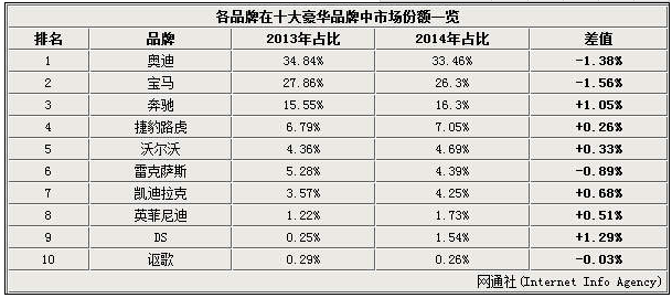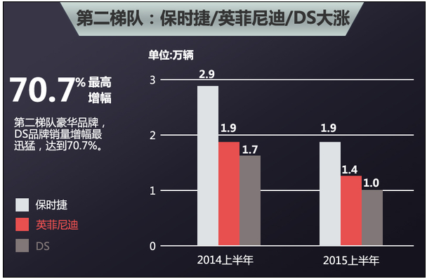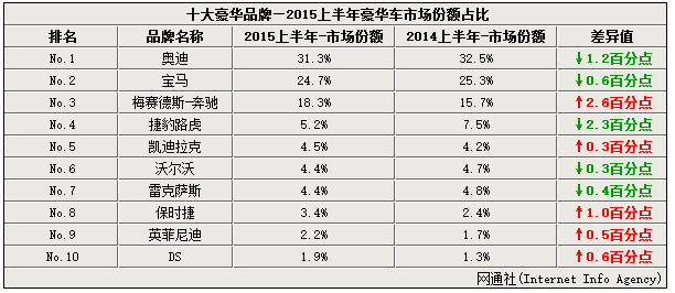 與2014年相比,2015年上半年德系豪華品牌中奔馳的市場占有率進一步提升之外,奧迪、寶馬市場占有率均有下降,同時DS、英菲尼迪、凱迪拉克凱迪拉克三個品牌占有率明顯上升。
