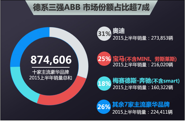 同時,一線豪華品牌尤其是德系傳統(tǒng)三大豪華品牌的市場份額明顯下降,其中寶馬、奧迪兩家德系豪華品牌市場份額自2014年至今已連續(xù)下降,2013年末奧迪在豪華品牌中市場份額接近35%而到2015年上半年已降至31.3;寶馬2013年市場份額接近28%,至2015年已降低24.7%。