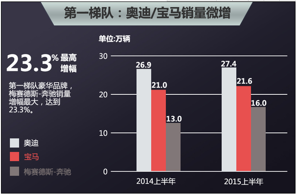 雖然2015上半年中國汽車市場呈現(xiàn)整體銷量增幅放緩的態(tài)勢,但是豪華品牌的市場份額并沒有太大變化,奧迪、寶馬、奔馳三大品牌占比依然雄踞74.3%,同比去年還有微增。反觀二線豪華品牌,多半數(shù)憑借多樣化國產新車實現(xiàn)快速增長,而部分車企銷量業(yè)績出現(xiàn)下滑,因此年底國內二線豪華品牌的市場地位有望重新洗牌。(網通社 2015年7月20日 北京報道)