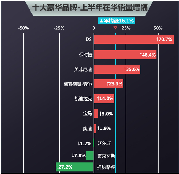 由于豪華品牌第一梯隊中,奧迪、寶馬的銷量增速放緩,二線豪華品牌由此迎來了更多機遇。其中凱迪拉克、保時捷、英菲尼迪以及DS四個豪華品牌,上半年在華銷量持續(xù)增長,以DS品牌增幅最為迅猛,同比漲70.7%至16,693輛。凱迪拉克在華銷量僅次于捷豹路虎,超越沃爾沃、雷克薩斯,排名第五,市場份額提升0.3個百分點至4.5%。