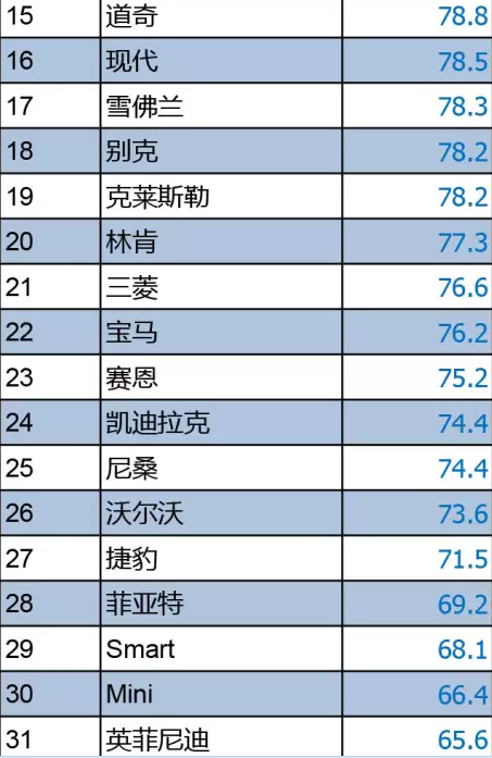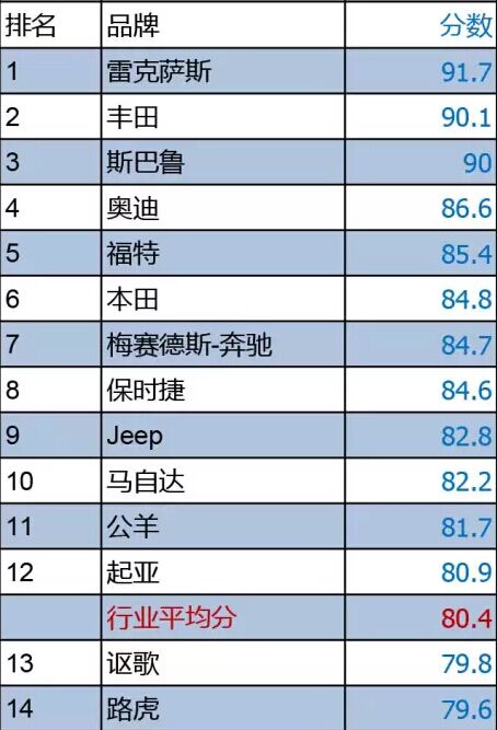 雷克薩斯在這一領域的得分最高是91.8分,而大眾排名墊底僅有59.3分。