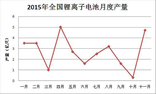 鋰離子電池2015年的產(chǎn)量呈現(xiàn)出不穩(wěn)定狀態(tài),波動幅度較大,其中三月到四月,十月到十一月的產(chǎn)量都是直線上升。
