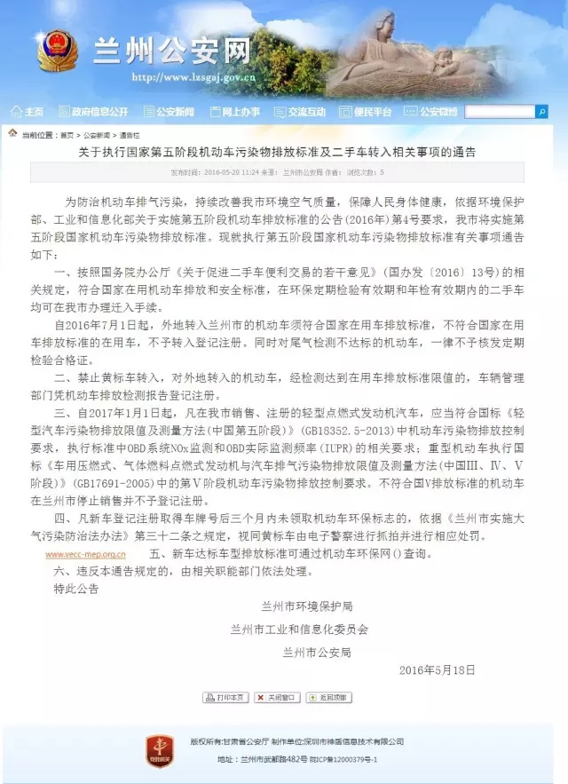 5月18日,蘭州市公安局、蘭州市環(huán)保局、蘭州市工業(yè)與信息化委員會聯(lián)合發(fā)布了《關(guān)于執(zhí)行國家第五階段機(jī)動車污染物排放標(biāo)準(zhǔn)及二手車轉(zhuǎn)入相關(guān)事項(xiàng)的通告》 ,明確自2016年7月1日起,取消本市二手車遷入限制!