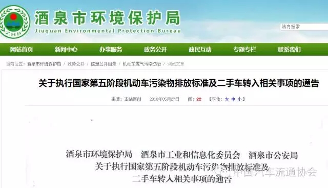 近期,甘肅省酒泉市環(huán)保局、工業(yè)和信息化委員會(huì)、公安局聯(lián)合發(fā)布了《關(guān)于執(zhí)行國(guó)家第五階段機(jī)動(dòng)車(chē)污染物排放標(biāo)準(zhǔn)及二手車(chē)轉(zhuǎn)入相關(guān)事項(xiàng)的通告》。