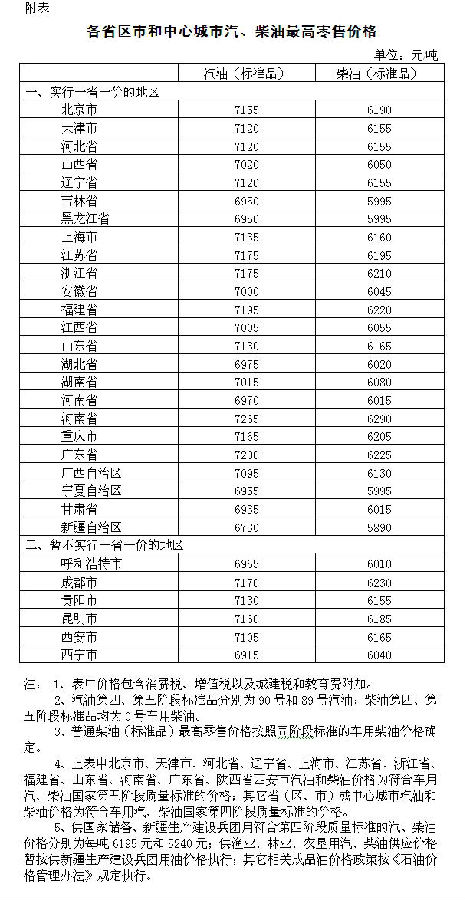 附:各省區(qū)市和中心城市汽、柴油最高零售價(jià)格表