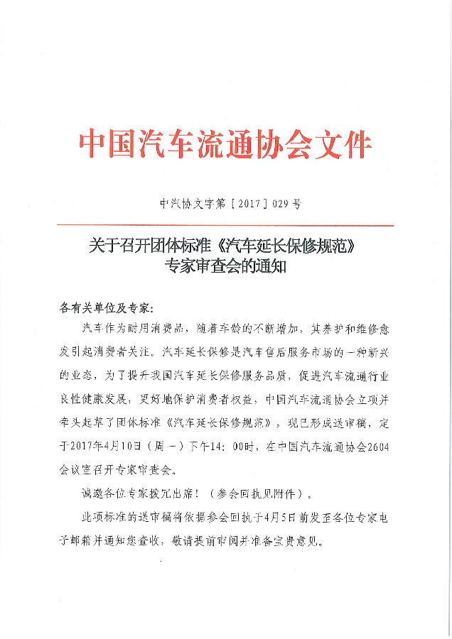 關(guān)于召開團體標(biāo)準《汽車延長保修規(guī)范》專家審查會的通知