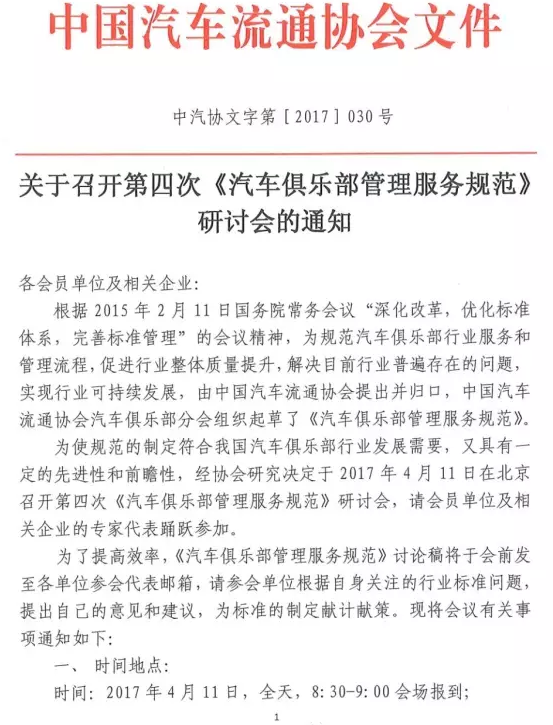 關(guān)于召開第四次《汽車俱樂部管理服務(wù)規(guī)范》研討會(huì)的通知