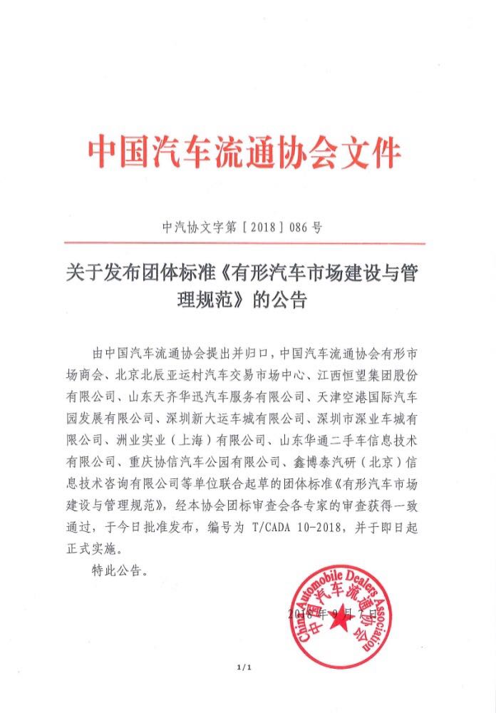 由中國汽車流通協(xié)會提出并歸口,中國汽車流通協(xié)會有形市場商會、北京北辰亞運村汽車交易市場中心、江西恒望集團(tuán)股份有限公司、山東天齊華迅汽車服務(wù)有限公司、天津空港國際汽車園發(fā)展有限公司、深圳新大運車城有限公司、深圳市深業(yè)車城有限公司、洲業(yè)實業(yè)(上海)有限公司、山東華通二手車信息技術(shù)有限公司、重慶協(xié)信汽車公園有限公司、鑫博泰汽研(北京)信息技術(shù)咨詢有限公司等單位聯(lián)合起草的團(tuán)體標(biāo)準(zhǔn)《有形汽車市場建設(shè)與管理規(guī)范》,經(jīng)本協(xié)會團(tuán)標(biāo)審查會各專家的審查獲得一致通過,于今日批準(zhǔn)發(fā)布,編號為T/CADA 10-2018,并于即日起正式實施。
