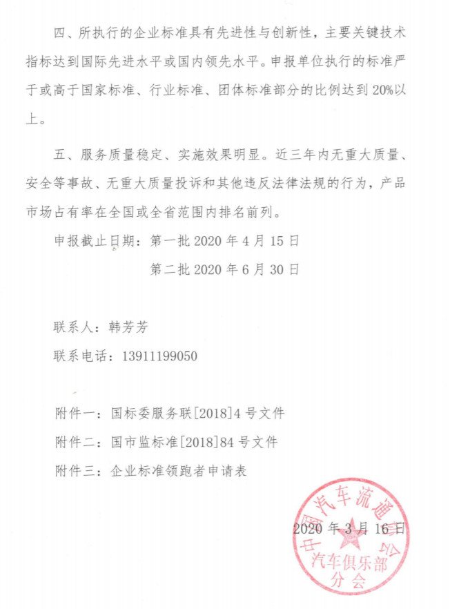 導(dǎo)讀:為激發(fā)企業(yè)質(zhì)量提升內(nèi)升動(dòng)力及核心競(jìng)爭(zhēng)力,提高汽車服務(wù)技術(shù)水平,讓更多企業(yè)以先進(jìn)標(biāo)準(zhǔn)引領(lǐng)質(zhì)量提升,促進(jìn)轉(zhuǎn)型升級(jí),進(jìn)一步推動(dòng)服務(wù)行業(yè)高質(zhì)量發(fā)展,在汽車流通領(lǐng)域組織開展企業(yè)標(biāo)準(zhǔn)“領(lǐng)跑者”工作,通知如下:
