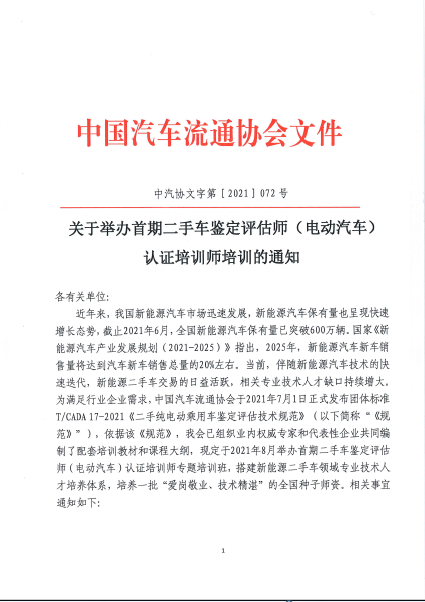關(guān)于舉辦首期二手車鑒定評估師(電動汽車)認(rèn)證培訓(xùn)師培訓(xùn)的通知