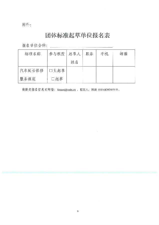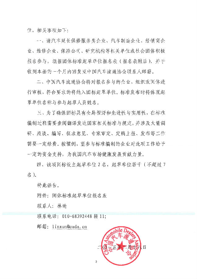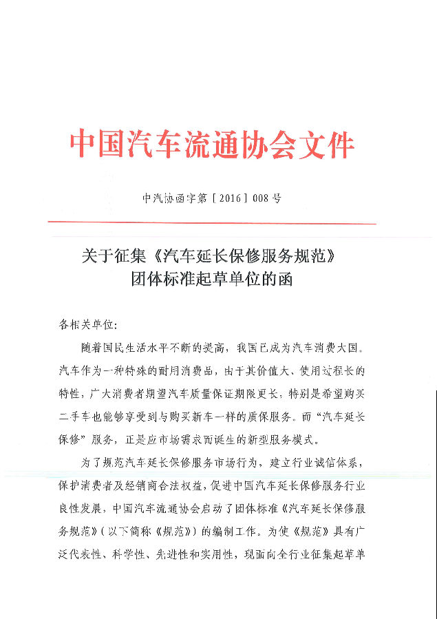 關(guān)于征集《汽車延長(zhǎng)保修服務(wù)規(guī)范》團(tuán)體標(biāo)準(zhǔn)起草單位的函