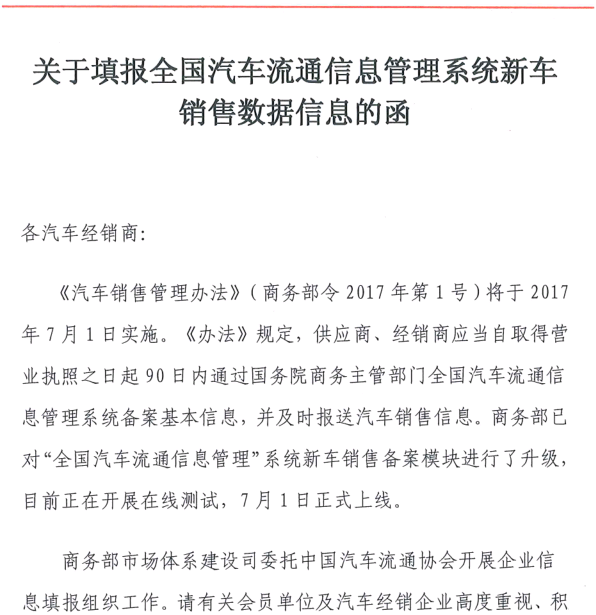 關(guān)于填報全國汽車流通信息管理系統(tǒng)新車銷售信息數(shù)據(jù)的函