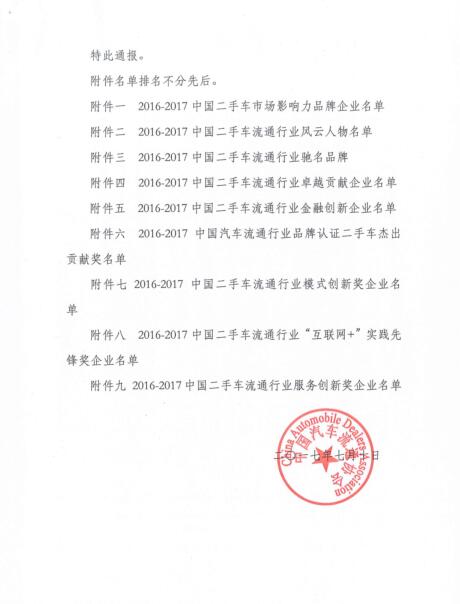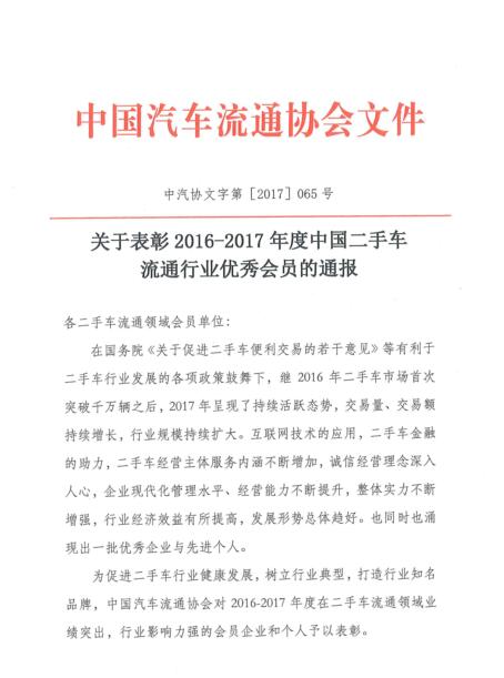 關(guān)于表彰2016-2017年度中國二手車流通行業(yè)優(yōu)秀會員的通報