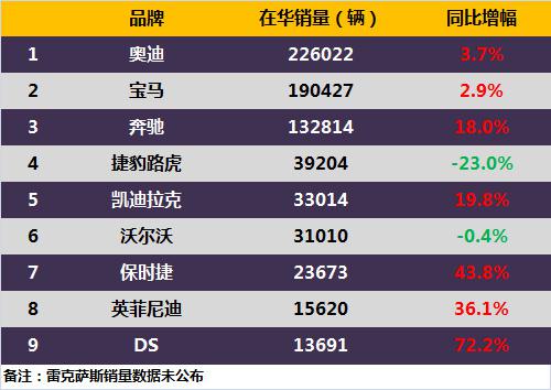 這九大豪華品牌,包括了傳統(tǒng)三強奔馳、寶馬、奧迪,二線豪華的捷豹路虎、沃爾沃、凱迪拉克、英菲尼迪、DS,以及超豪華的保時捷。