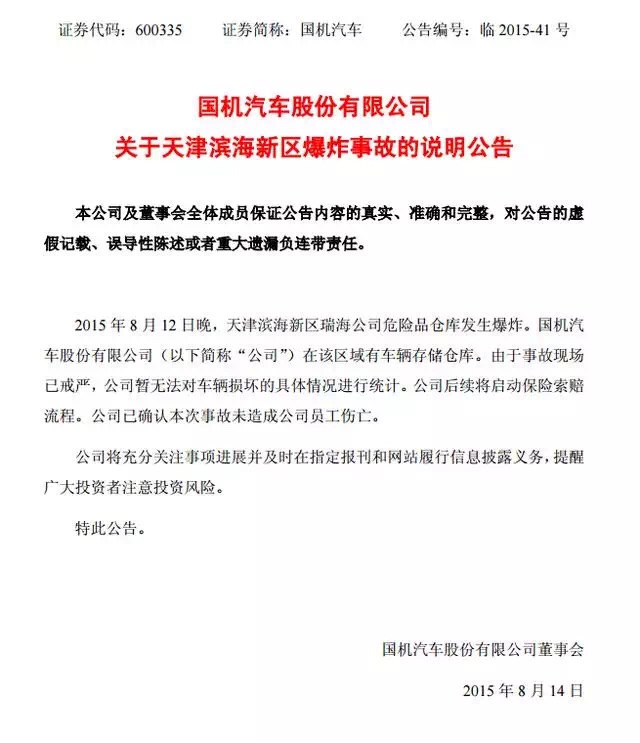 國(guó)機(jī)汽車股份有限公司關(guān)于天津?yàn)I海新區(qū)爆炸事故的說(shuō)明公告
