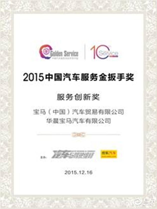 近日,寶馬(中國)汽車貿易有限公司攜手華晨寶馬汽車有限公司榮膺“2015中國汽車服務金扳手獎--服務創(chuàng)新獎”,此獎項由《汽車與駕駛維修》雜志和搜狐汽車事業(yè)部共同頒發(fā)。這標志著寶馬已連續(xù)六年獲得金扳手獎項提名,并五次獲得這一殊榮。