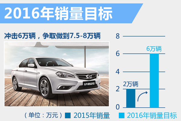 數(shù)據(jù)顯示,2015年北汽新能源銷量達2萬輛,今年北汽新能源將投放五款新車,銷量目標也有很大的提升,年內將沖擊6萬輛銷量目標,爭取做到7.5-8萬輛的成績單。從今年北汽新能源公布的銷量目標來看,企業(yè)對年內投放的多款新車充滿信心。