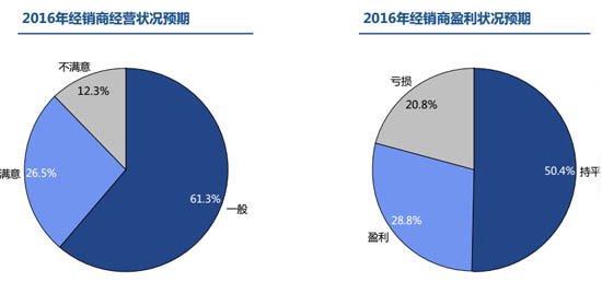據(jù)介紹,2015年,有29.6的經(jīng)銷商對(duì)經(jīng)營(yíng)狀況不滿意,相比2014年增加了7.0個(gè)百分點(diǎn),僅有20.2%的經(jīng)銷商對(duì)經(jīng)營(yíng)狀況滿意。有48.5%的經(jīng)銷商盈利狀況為持平,21.8%的經(jīng)銷商盈利,29.7%的經(jīng)銷商處于虧損狀態(tài)。有26.5%的經(jīng)銷商預(yù)計(jì)2016年的經(jīng)營(yíng)狀況滿意。有28.8%的經(jīng)銷商認(rèn)為2016年盈利,認(rèn)為虧損的比例僅有兩成。