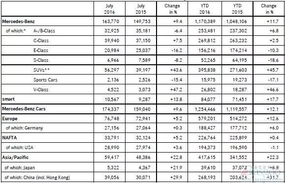 2016年7月份,奔馳汽車全球銷量為174,337輛,較2015年7月份的159,040輛同比增長9.6%;其中豪車品牌奔馳上個月的全球銷量為163,770輛,較去年同期的149,753輛同比增長9.4%,連續(xù)41個月創(chuàng)下銷量紀(jì)錄;Smart品牌為10,567輛,同比攀升13.8%。