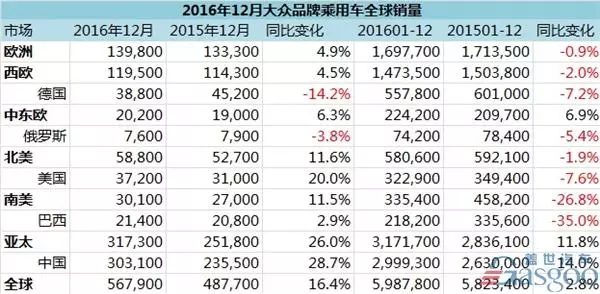 2016年,大眾品牌乘用車全球銷量較2015年銷量增長(zhǎng)2.8%,全年交付銷量達(dá)599萬(wàn)輛,高出2015年164,000輛。其中,2016年12月全球銷量勁增16.4%,達(dá)567,900輛。