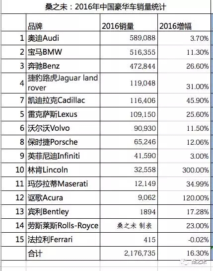 In 2016,the sales volume of luxury car is more than 2 million for the first time inChina market. 14 luxury brands sold 2,178,099 cars in total, with a YoY growthof 16.3%, leading in the whole passenger car market. At the end of the year,luxury car companies have announced the sales performance, through which wecould clearly see the exclusivity and the comprehensive strength.