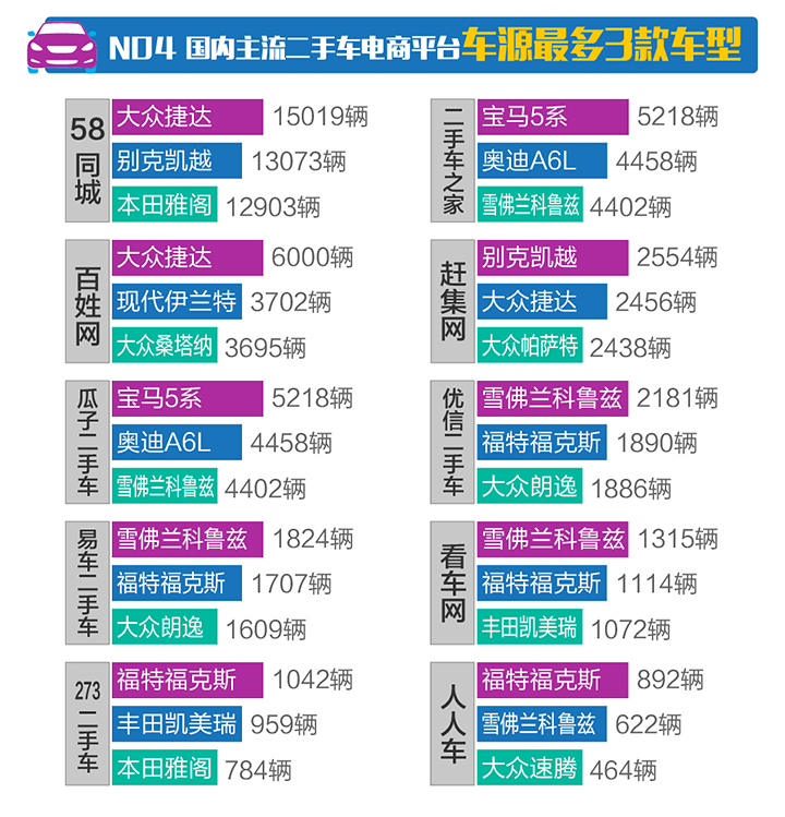 四、2017年3月國(guó)內(nèi)主流二手車(chē)電商平臺(tái)車(chē)源最多3款車(chē)型