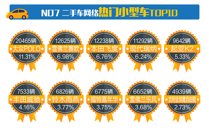 受網(wǎng)友要求,本月數(shù)據(jù)分析中新增各級(jí)別車(chē)型中的熱門(mén)車(chē)源。熱門(mén)小型車(chē)TOP10依次是:大眾Polo、雪佛蘭賽歐、本田飛度、現(xiàn)代瑞納、起亞K2、豐田威馳、鈴木雨燕、福特嘉年華、雪佛蘭樂(lè)風(fēng)、吉利全球鷹自由艦。
