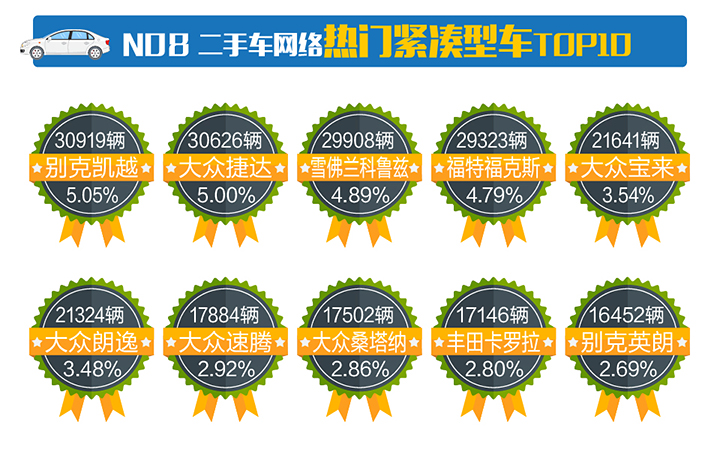 熱門(mén)緊湊型車(chē)TOP10依次是:別克凱越、大眾捷達(dá)、雪佛蘭科魯茲、福特??怂埂⒋蟊妼殎?lái)、大眾朗逸、大眾速騰、大眾桑塔納、豐田卡羅拉、別克英朗。其中大眾家族攜帶5款車(chē)型進(jìn)入榜單,占據(jù)50%。別克2款,雪佛蘭1款,福特1款,豐田1款。