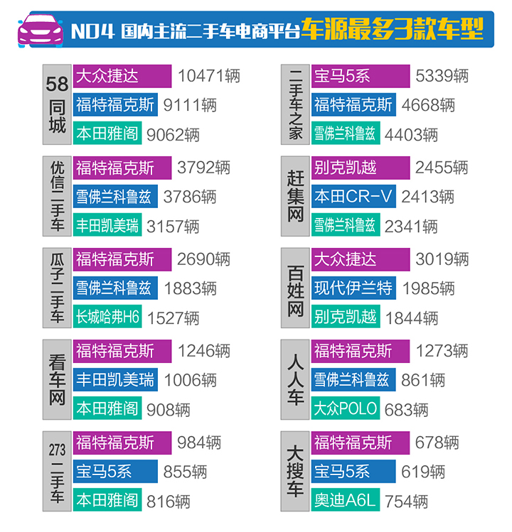 參考各個平臺車源最多的三款車型,想購買這些車型的朋友可以去對應(yīng)平臺選購,車源多,選擇空間大,可以盡情挑選優(yōu)質(zhì)車況車輛,殺價(jià)砍價(jià)。綜合十大平臺最多的3款車型,福特??怂埂⒀┓鹛m科魯茲、別克凱越車源夠多,與這些車的市場保有量大有直接的關(guān)系。