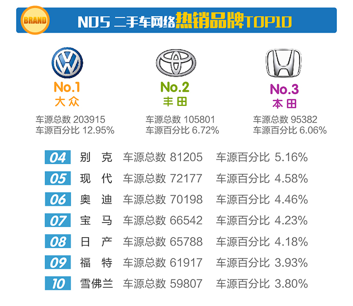 2017年10月熱銷品牌TOP10依次是:大眾、豐田、本田、別克、現(xiàn)代、奧迪、寶馬、日產、福特、雪佛蘭,上榜品牌與9月一致。其中,奧迪由第7位上升到第6位,寶馬由第9位上升到第7位,日產由第6位下降到第8位,福特也下降一位。10個品牌車源總量882732輛,占總車源56.06%。